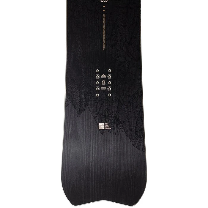 Strategic placement of carbon fiber from the tail to the rear inserts, and from the nose to the front inserts, resulting in a more reactive board, with increased pop and stiffness. It’s vibration dampening qualities make it ideal for more aggressive riding in all conditions.